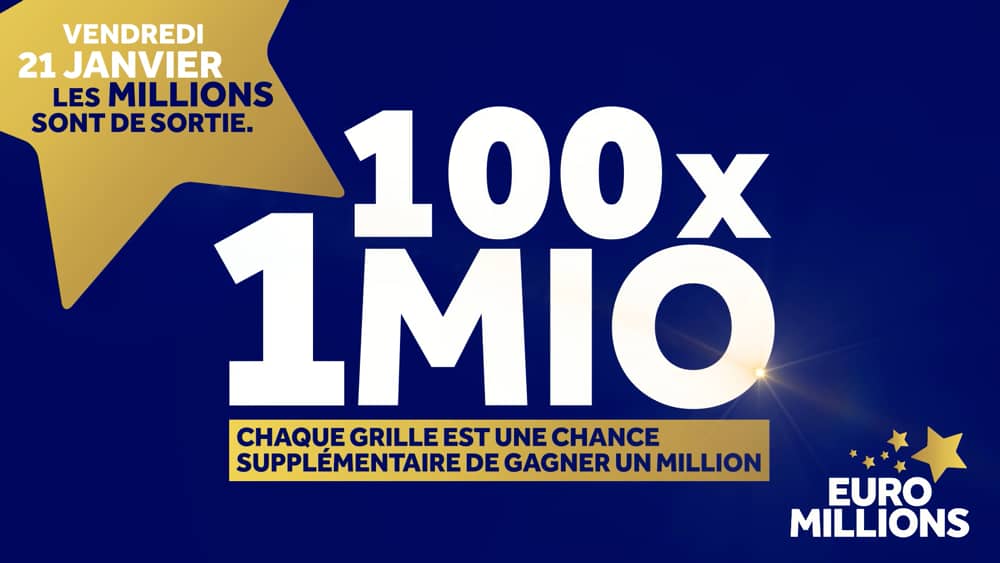 Jackpot Euromillions de 17000000 100 millionnaires à 1000000 ce vendredi 21 janvier 2022 Jouez avant 20h15 ce soir. Cela veut dire que 100 Européens dont certainement quelques Belges commenceront lannée en beauté. Sélectionnez une date de tirage pour voir plus dinformations incluant une répartition complète des prix les codes UK Millionaire Maker les codes My Million français et dautres informations sur les tirages complémentaires.